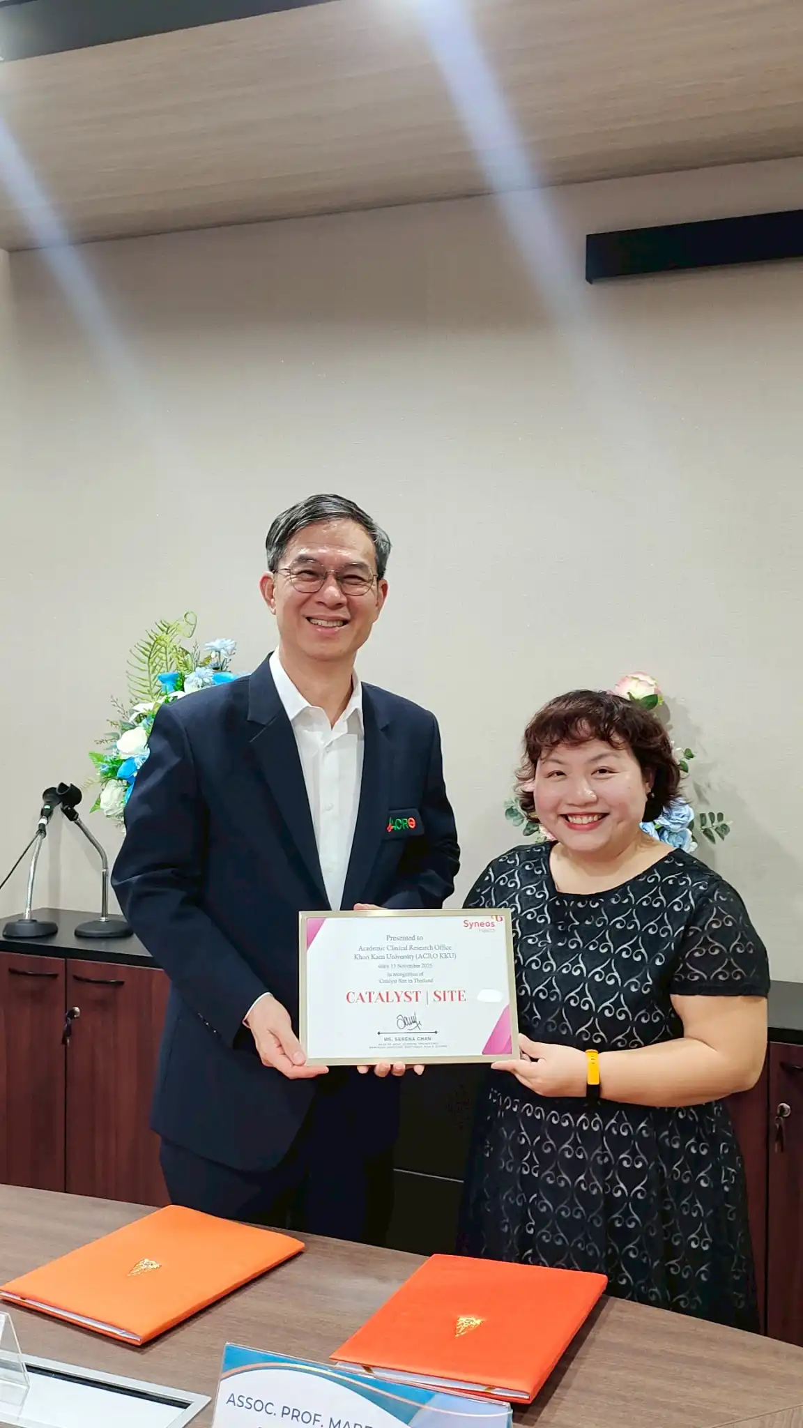 ศาสตราจารย์ นพ.ภพ โกศลารักษ์ ผู้อำนวยการสถานบริหารจัดการงานวิจัยคลินิก มหาวิทยาลัยขอนแก่น (Academic Clinical Research Office, Khon Kaen University – ACRO KKU) คณะแพทยศาสตร์ มหาวิทยาลัยขอนแก่น ได้ลงนามข้อตกลงความร่วมมือกับบริษัท Syneos Health เมื่อวันที่ 13 พฤศจิกายน 2568 เพื่อสนับสนุนและส่งเสริมการดำเนินงานวิจัยทางคลินิกในประเทศไทยอย่างเป็นทางการ ภายใต้โครงการ Syneos Health Catalyst Site Program